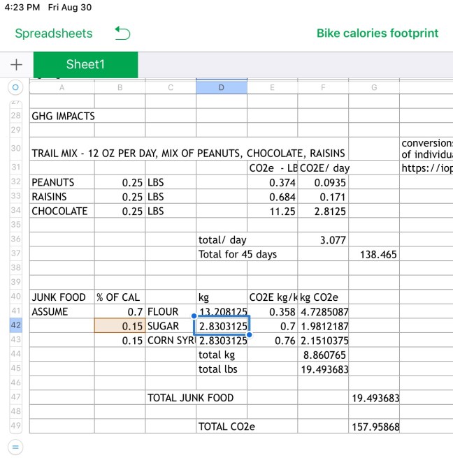 So what is the carbon impact of this trail mix and donuts (and donut equivalents)? I found a handy food products to life-cycle GHG equivalent emissions here . Based on some calculations, it looks like the trail mix worked out to about 3 lbs of CO2e per day, or about 138 pounds for the whole 45 days/47,000 calories of trail mix. Chocolate was the outsized carbon cost in the trail mix. The junk food was much more carbon efficient – about 20 pounds of CO2e for 75,000 calories. That’s almost an order of magnitude better than the trail mix, though I may be understating the trail mix calorie contribution. In calculating the junk food carbon emissions, I assumed 70% of the junk food calories came from flour, 15% from sugar, and 15% from corn syrup.