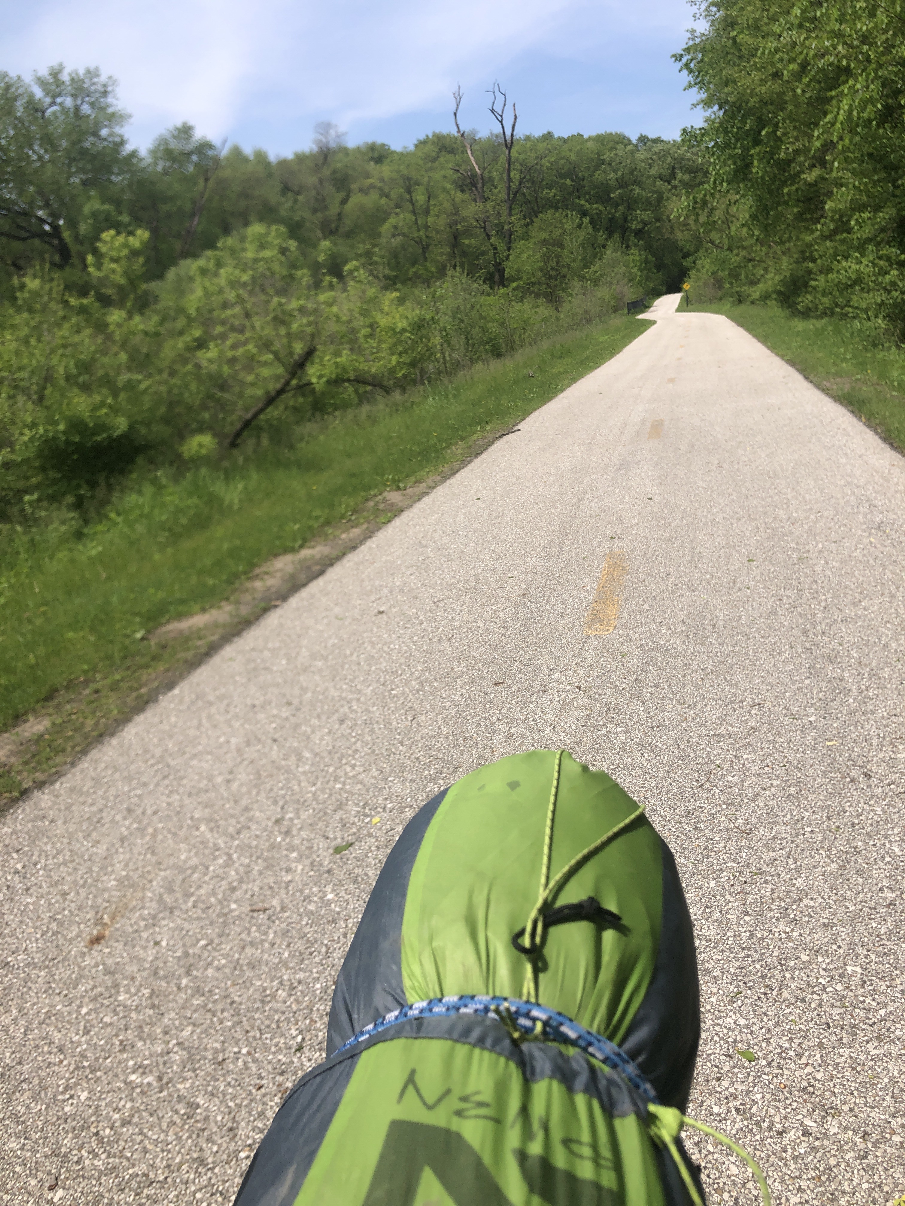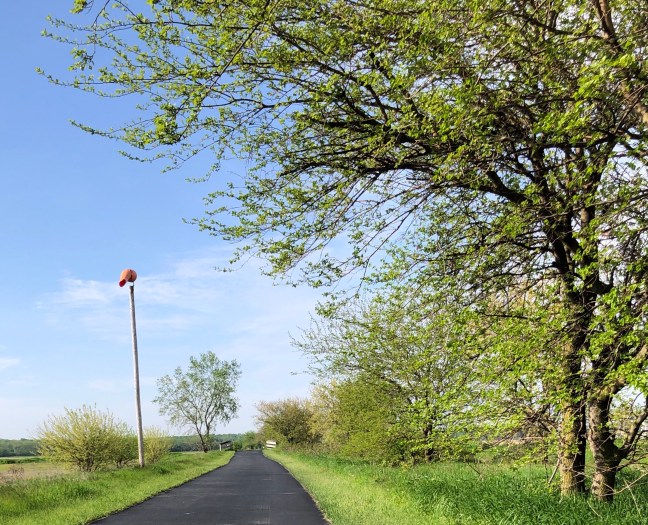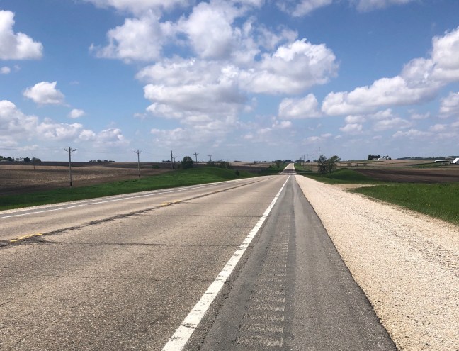 There was no privy at the county park I stayed at, and, besides lacking a shovel I didn’t want to dig a cat hole in a community park, so this morning I figured I could relieve myself when I found coffee. As the miles rolled by with no relief in sight, I remembered a bit of doggerel that my elementary school friend David Lynn was fond of – it went something like this: “When days were old, and knights were bold/And toilets were not yet invented/ They dropped their load beside the road / And went off quite contented.” The logic of this school rhyme eventually won out, and I added my nutrient leadings to the fertilizer runoff of central Iowa.