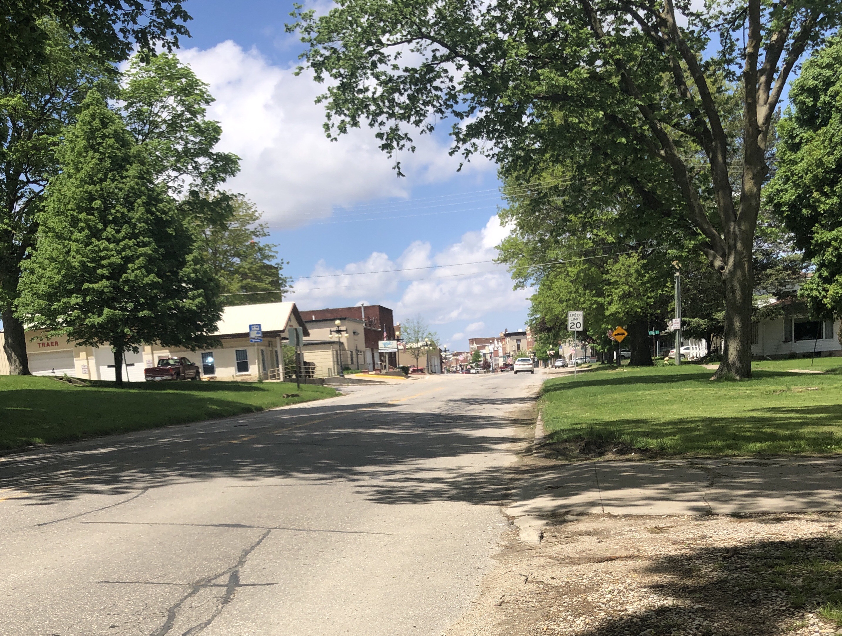 Stratford, at mile 40, finally had coffee at the gas stop. I spent a long time in the rest room cleaning up from my mishaps, then headed west with my sipping cup of coffee, thinking that with 40 miles under my belt I could soon start looking for a lunch place with WiFi. Surely a town called Dayton, home of the Dayton Rodeo, would have a lunch place. But they were all closed on this Sunday, and I did not want to succumb to lunch at the Casey’s General Store chain. I detoured a mile to Gowrie, same story. Also in Farnhamville, where a sign invited the traveler to turn right and visits the Lucky Pig pub and grill, quite closed. The American Legion members, in full dress for a memorial ceremony, told me that the only thing that would be open today anywhere was a Casey’s the next one in 8 miles. So I stopped to pick up a picnic lunch at Casey’s General in Lohrville. When I asked the clerk about camping at Black Hawk, he said he didn’t know, but that there was public wifi at Casey’s. So I switched my order to a sit down lunch, and got caught up with the internet. Black Hawk reserves some sites for “walk ups”, so there was some chance, at least. With no phone signal I still could not phone ahead.