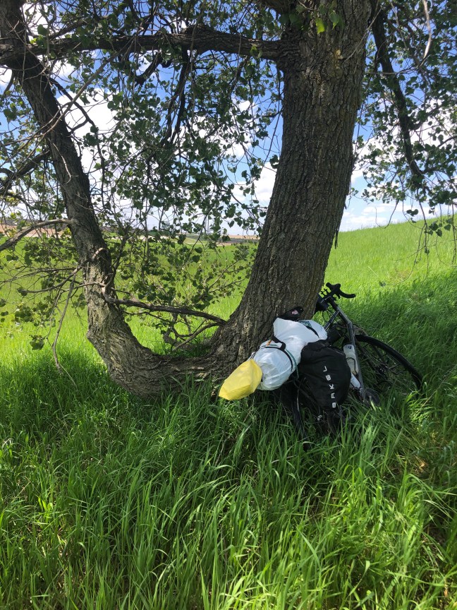 But I could not waste this morning’s easterly breeze on guitar playing, so I packed up and headed west. I did not have a clear plan for the day, given that I had no internet access to figure out camping or lodging options. So I just set out to make some westerly miles, assuming I would find a cell connection or WiFi on the way somewhere. My goal is to make a Century whenever the wind blows from the east, to make up for the inevitable westerly headwind days to come.