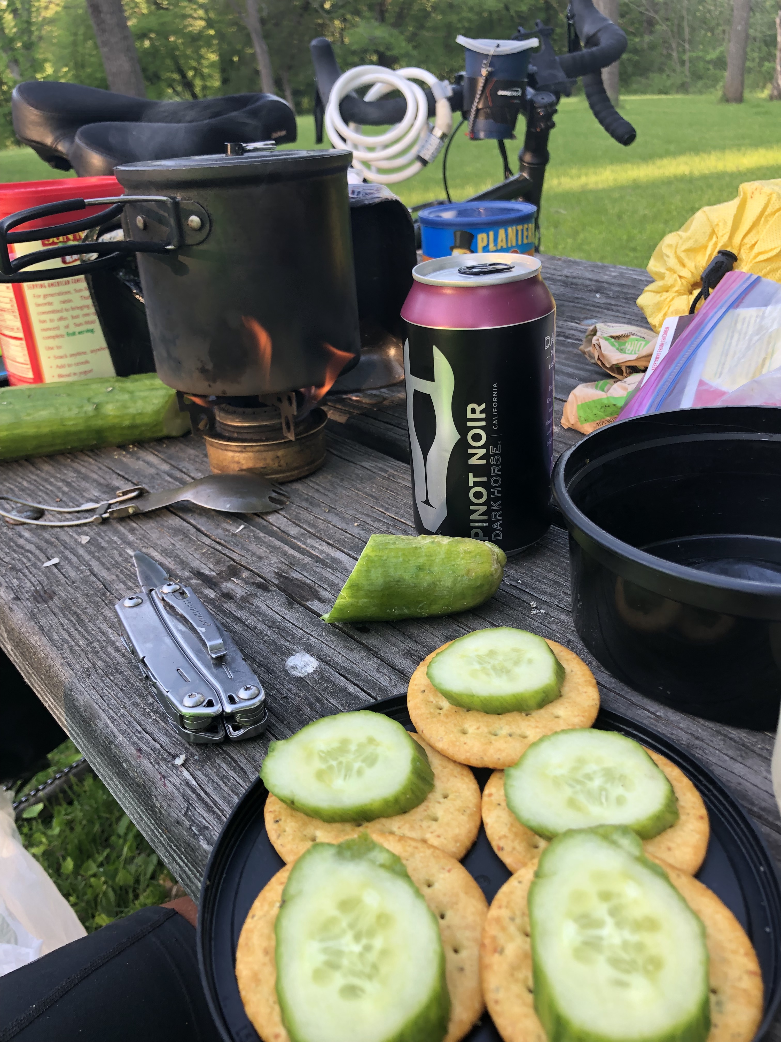 At mile 95, I went shopping at the last chance before the state park – the “Sparky’s Market” at the Sinclair station in Auburn. The healthiest dinner I could put together was Kraft mac and cheese plus a can of green peas. But at least they had 24 oz Bid singles.