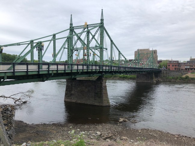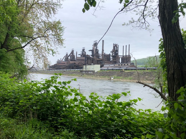 The route towards Cleveland followed Route 51 northwest along the Ohio River. Google tried to take me to a dead and street with a bike path that itself deadended in a pile of gravel within 50 yards, so I ended up in the traffic on Carson Boulevard, and nearly got clipped by a city bus. A few miles further along, Google tried to avoid the worst of the hills by detouring to Bruno Island, but the bridge it tried to send me on was definitively closed for construction, so I was left with the formidable hills of route 51. So I did not end up crossing any of the fabled bridges of Pittsburgh.